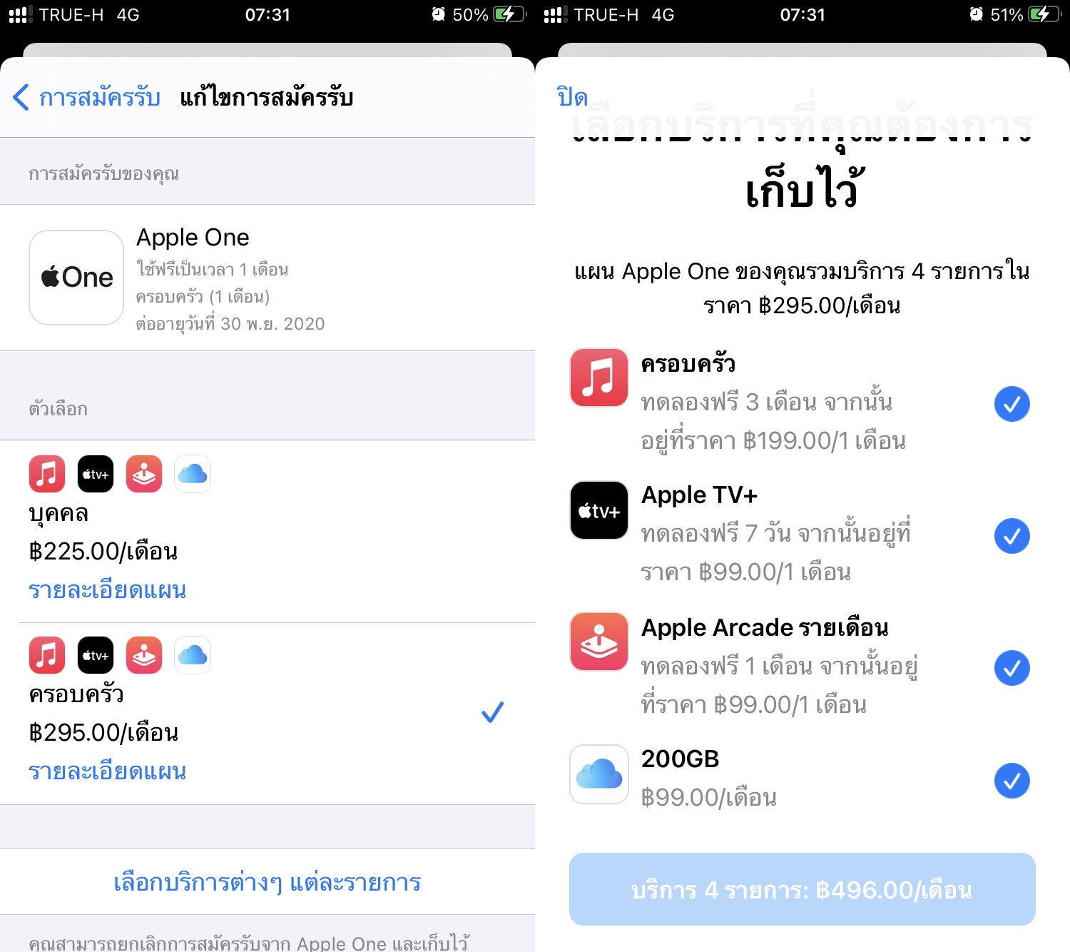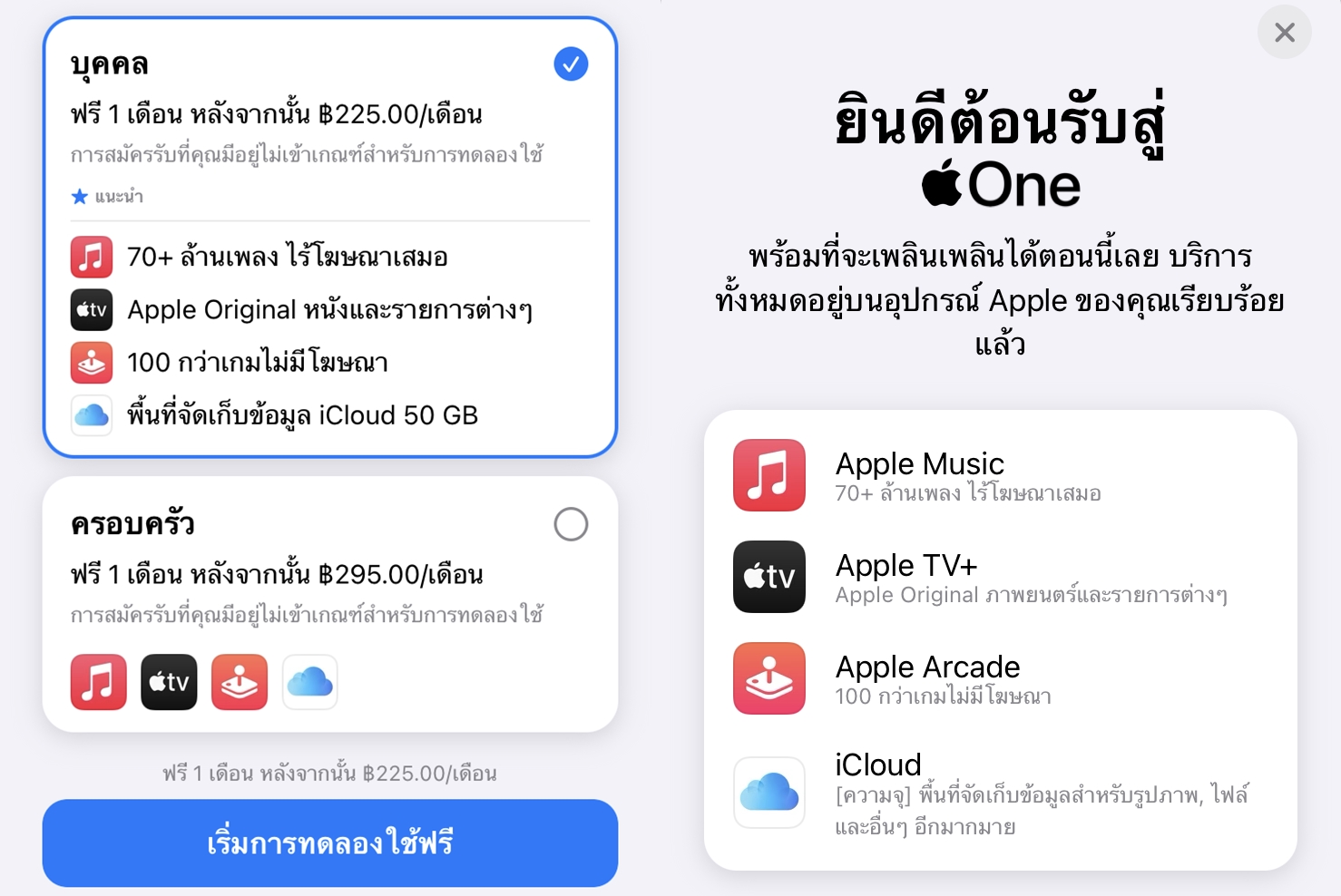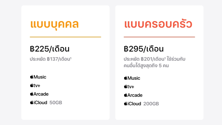 ค่าบริการมี 2 แบบคือ สมัครรายบุคคล 225 บาท และครอบครัว 295 บาท โดยมี iCloud 50GB สำหรับแบบบุคคล ส่วนแบบครอบครัวจะได้ iCloud 200GB และหากเทียบ 4 บริการ ปกติต้องจ่าย 496 บาท ต่อเดือน (ถ้าซื้อครบทุกอย่าง) ดังนั้นการมัดรวมแพ็กเกจจะคุ้มกว่า แต่ทั้งนี้ขึ้นอยู่กับว่าเราใช้อะไร