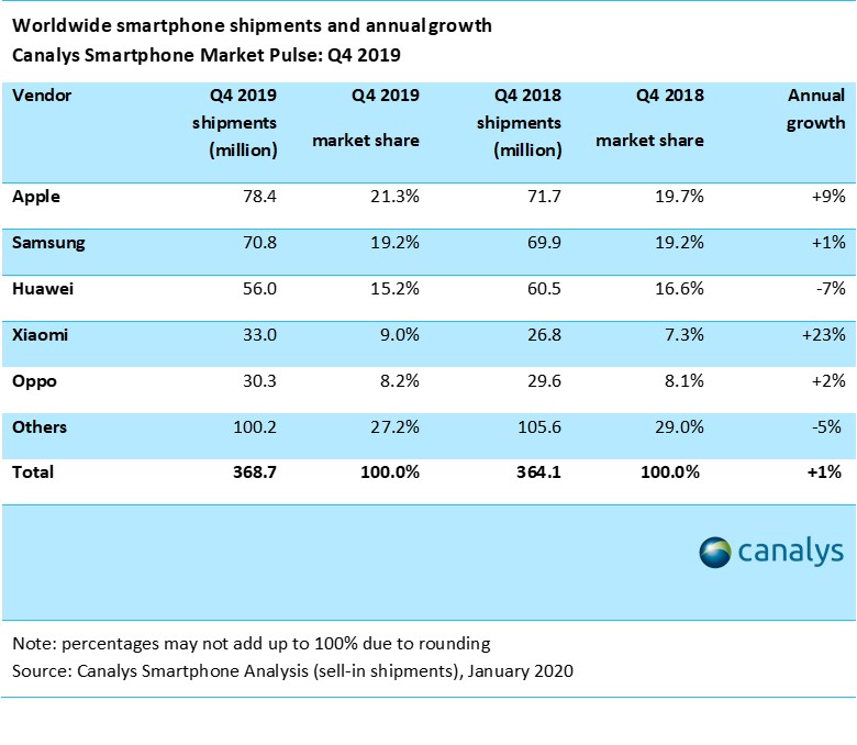ยอดจำหน่ายสมาร์ทโฟนทั่วโลก เติบโตขึ้น 1% ใน Q4 2019 โดยเติบโตเป็นไตรมาสที่ 2 ติดต่อกัน ซึ่งมียอดขายแตะ 369 ล้านเครื่อง Apple กลับมาแข็งแกร่งอีกครั้ง เพราะ iPhone รุ่นใหม่น่าสนใจมาก โดยเฉพาะ iPhone 11 โดยเติบโตขึ้น 9% ถึง 78 ล้านเครื่อง ส่วน Samsung มียอดขาย 71 ล้านเครื่อง ยังคงเติบโตสูงขึ้น 1% ในขณะที่ Huawei หลังจากที่ไม่มี GMS อยู่ในอันดับที่ 3 ลดลง 7% ส่วน Xiaomi อยู่ในอันดับที่ 4 เติบโต 23% โดยมียอดขาย 33 ล้านเครื่อง ในขณะที่ OPPO อยู่ในอันดับที่ 5 เติบโตขึ้น 2% จำนวน 30 ล้านเครื่อง