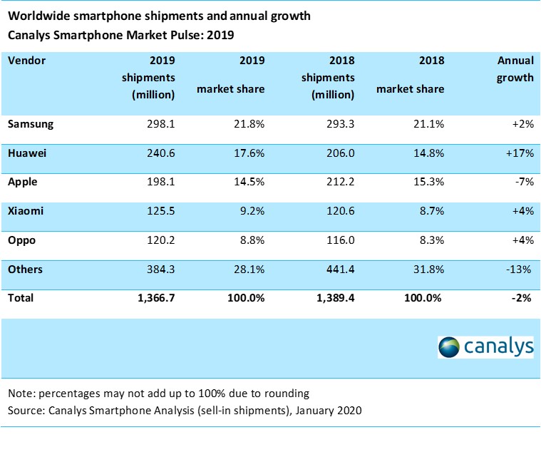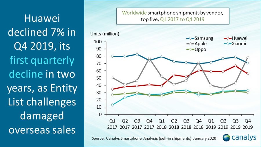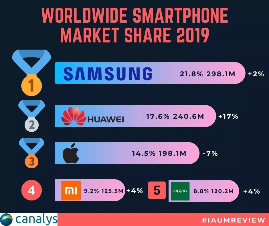 ข้อมูลจาก Canalys แสดงให้เห็นว่า อันดับ 1 คือ Samsung ตามมาด้วย Huawei และ Apple แม้ว่าใน Q4 Apple จะกลับมาเป็นที่ 1 ได้ แต่ภาพรวมยังคงไม่สามารถแซง Huawei ขึ้นมาได้