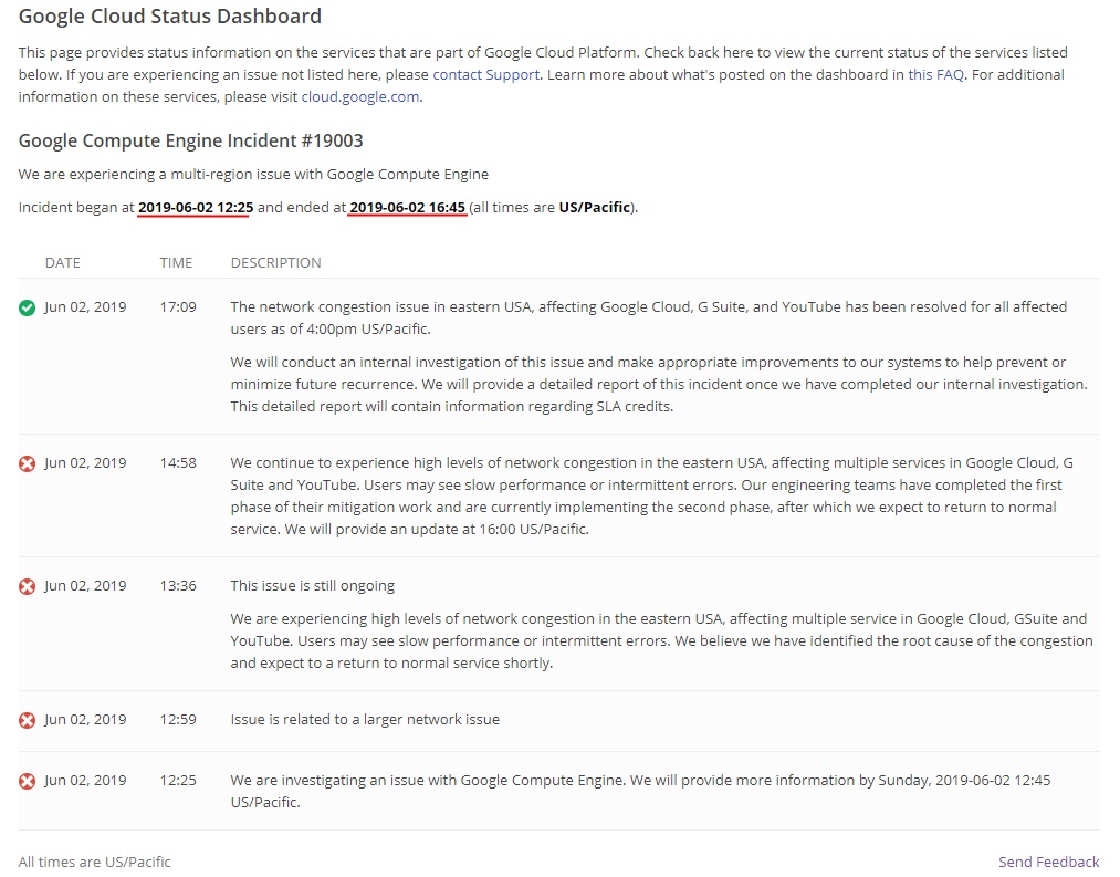ต้นเหตุของปัญหา เกิดจากมีการใช้งานที่หนาแน่นจนทำให้เกิดการแออัดบนเครือข่ายในภาคตะวันออกของสหรัฐอเมริกา ซึ่งส่งผลกระทบต่อบริการ Google Cloud, G Suite และ YouTube ผู้ใช้พบการใช้งานช้าผิดปกติ และเจอหน้าจอผิดพลาดเป็นระยะ