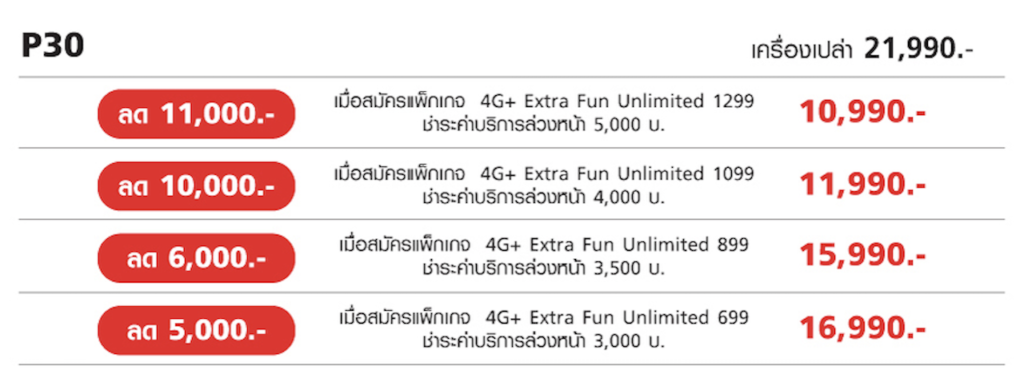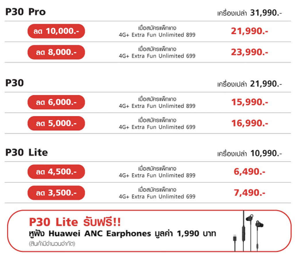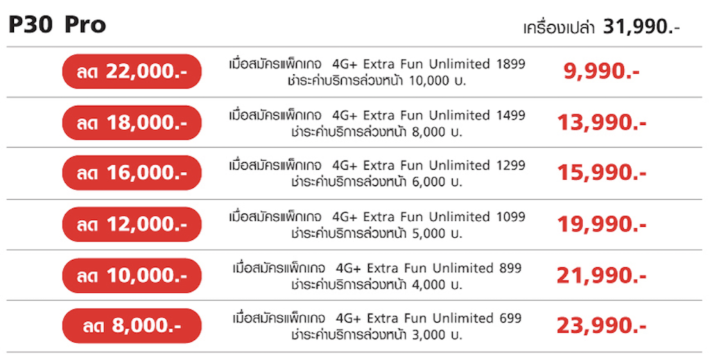 ยาแรงสุดของวันนี้ ขอมอบให้โปรส่วนลดการจองล่วงหน้า ภายในวันที่ 8 เม.ย.62 ทาง http://www.truemoveh.com/HuaweiP30/preorder และที่ทรูช้อปทั่วประเทศ ที่ให้ส่วนลดกันสูงสุดเกือบ 70% จากราคาเต็ม 31,990 บาท ลดไปเลย 22,000 บาท เหลือค่าเครื่อง 9,990 บาท เมื่อสมัครแพ็กเกจ 4G+ Extra Fun Unlimited 1899 และจ่ายค่าบริการล่วงหน้า 10,000 บาท รวมชำระก้อนแรก 19,990 บาท (ไม่รวมภาษี) และเงิน 10,000 บาท จะกลายเป็นส่วนลดค่าบริการรายเดือน 10 เดือนแรก เดือนละ 1,000 บาท โดยแพ็กนี้เหมาะกับคนใช้งานเน็ตและโทรเยอะ เดี๋ยวจะเล่าให้ฟังกันต่อไป