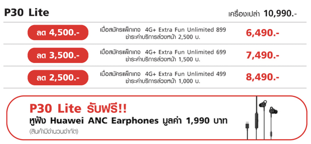 สำหรับคนที่ไม่ชอบจอโค้ง และคิดว่า Huawei P30 ก็พอแล้ว ตัวนี้เปิดราคาเครื่องเปล่ามาที่ 21,990 บาท และสามารถรับส่วนลดค่าเครื่องจากทรูมูฟ เอช ได้สูงสุด 11,000 บาท โดยราคานี้ เราจะจ่ายค่าเครื่องที่ 10,990 บาท และจ่ายค่าบริการล่วงหน้าที่ 5,000 บาท รวมก้อนแรกประมาณ 15,990 บาท (ไม่รวมภาษี) ส่วนโปรรายเดือนที่ได้ จะเป็นตัว 4G+ Extra Fun Unlimited 1299 ซึ่งก็ได้ 4G Unlimited ด้วยนะจ้ะ