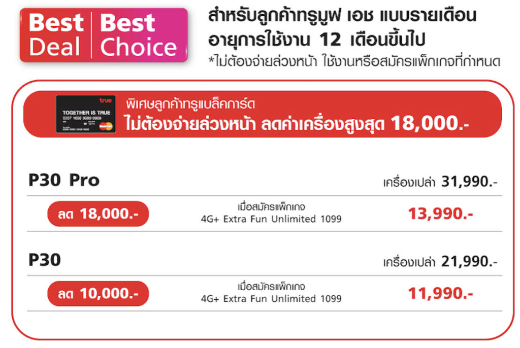 ใจเย็นๆ เดี๋ยวอุ้มจะเอายาแรงอีกอันนึงมาเล่าให้ฟัง เริ่มจากลูกค้าที่มี True Black Card กันก่อน และต้องอยู่กับทรูมูฟ เอชมาเกิน 12 เดือน สมมติว่าใช้แพ็กเกจรายเดือนราคา 1,099 บาทอยู่ ก็บอกน้องที่ทรูช้อป หรือที่ดูแลคุณว่า “พี่ขอเปลี่ยนมาใช้ 4G+ Extra Fun Unlimited 1099 แล้วเอา P30 Pro เครื่องนึง” เสร็จแล้วก็กวักเงินจ่ายไป 13,990 บาท(ไม่รวมภาษี) เป็นอันจบพิธี