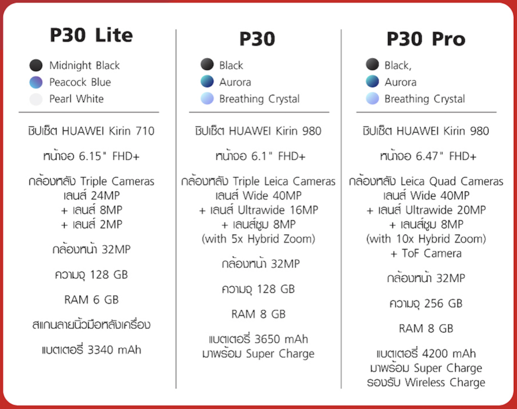 ตัวอย่างภาพต่างๆ ด้านบน คงจะแสดงประสิทธิภาพของ Leica Quad Camera ได้เป็นอย่างดี อุ้มขอสรุปสเปคของ Huawei P30 Pro และ Huawei P30 ตามด้านล่างนี้เลยนะคะ