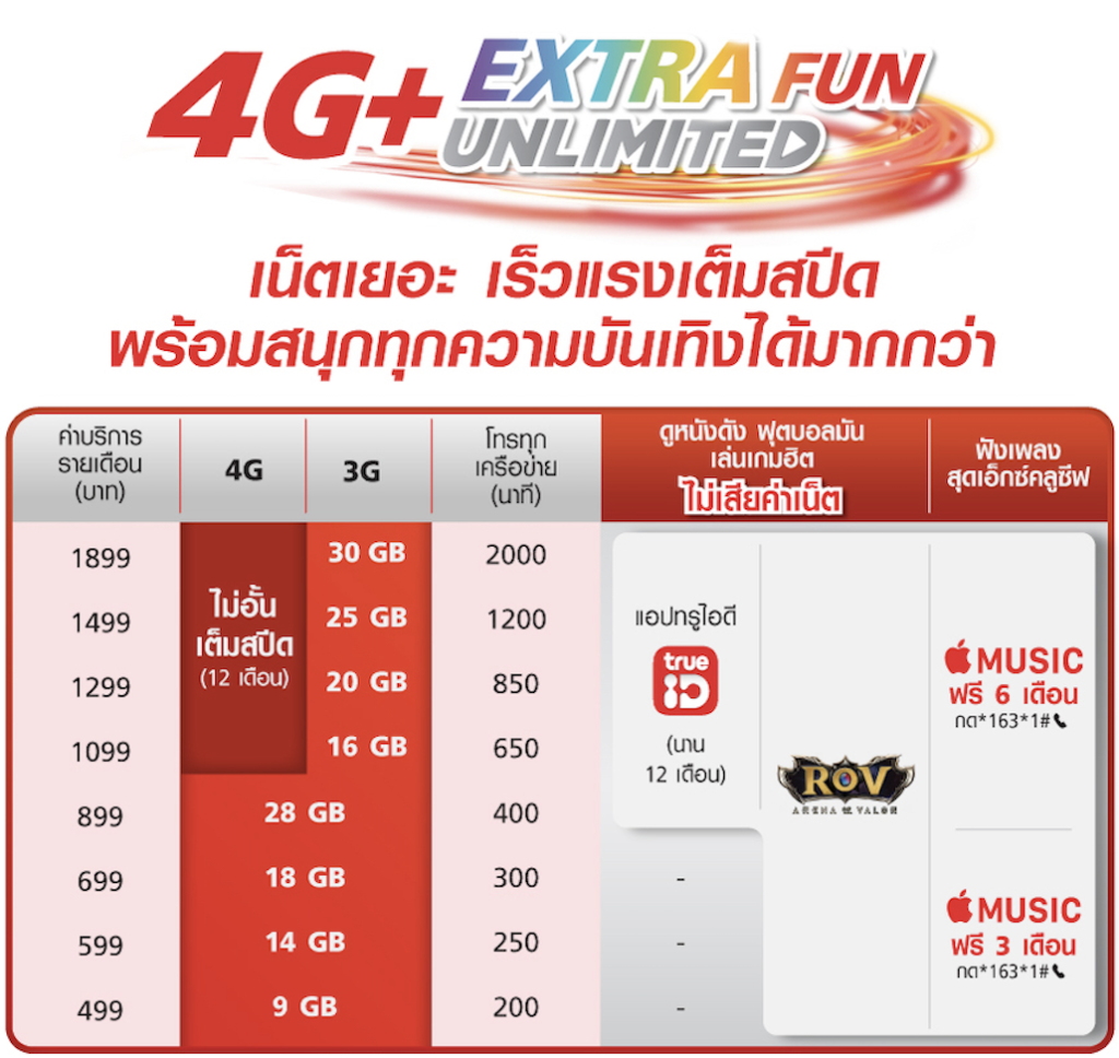 ซึ่งถ้าดูตัว 4G+ Extra Fun Unlimited ถ้าจะเอาคุ้ม ก็ต้องเป็นตัว 1099 ขึ้นไป เพราะได้เล่น 4G แบบ Unlimited โทรกันยาวๆ และยังได้ดู TrueID ไม่อั้น (ตอนนี้คอนเทนต์ดีมากนะ ลองโหลดกันดูได้) ได้เล่น RoV ไม่เสียค่าเน็ต และยังได้ฟัง Apple Music ฟรีอีก 6 เดือน ซึ่ง Apple Music ลงบน Huawei P30 Series ได้นะคะ 555