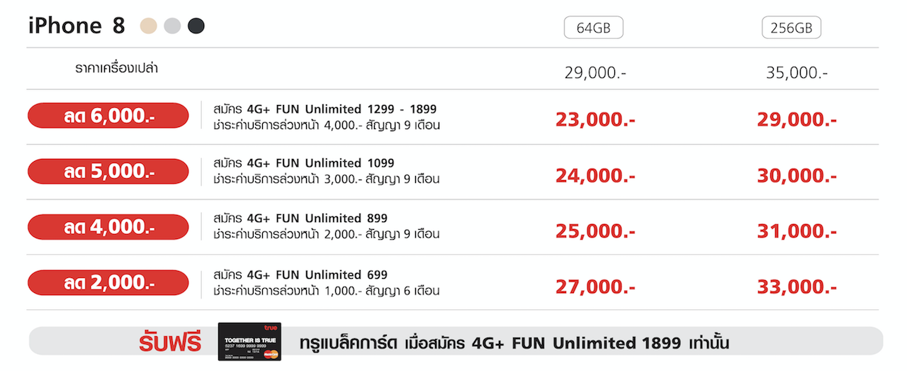 เราสามารถซื้อ iPhone 8 เครื่องเปล่า ได้ที่ราคา 29,000 บาท ในรุ่น 64GB และ 35,000 บาท ใน 256 GB โดยทางทรูมูฟ เอช จะมอบส่วนลดให้ทั้งหมด 4 ช่วงดังนี้