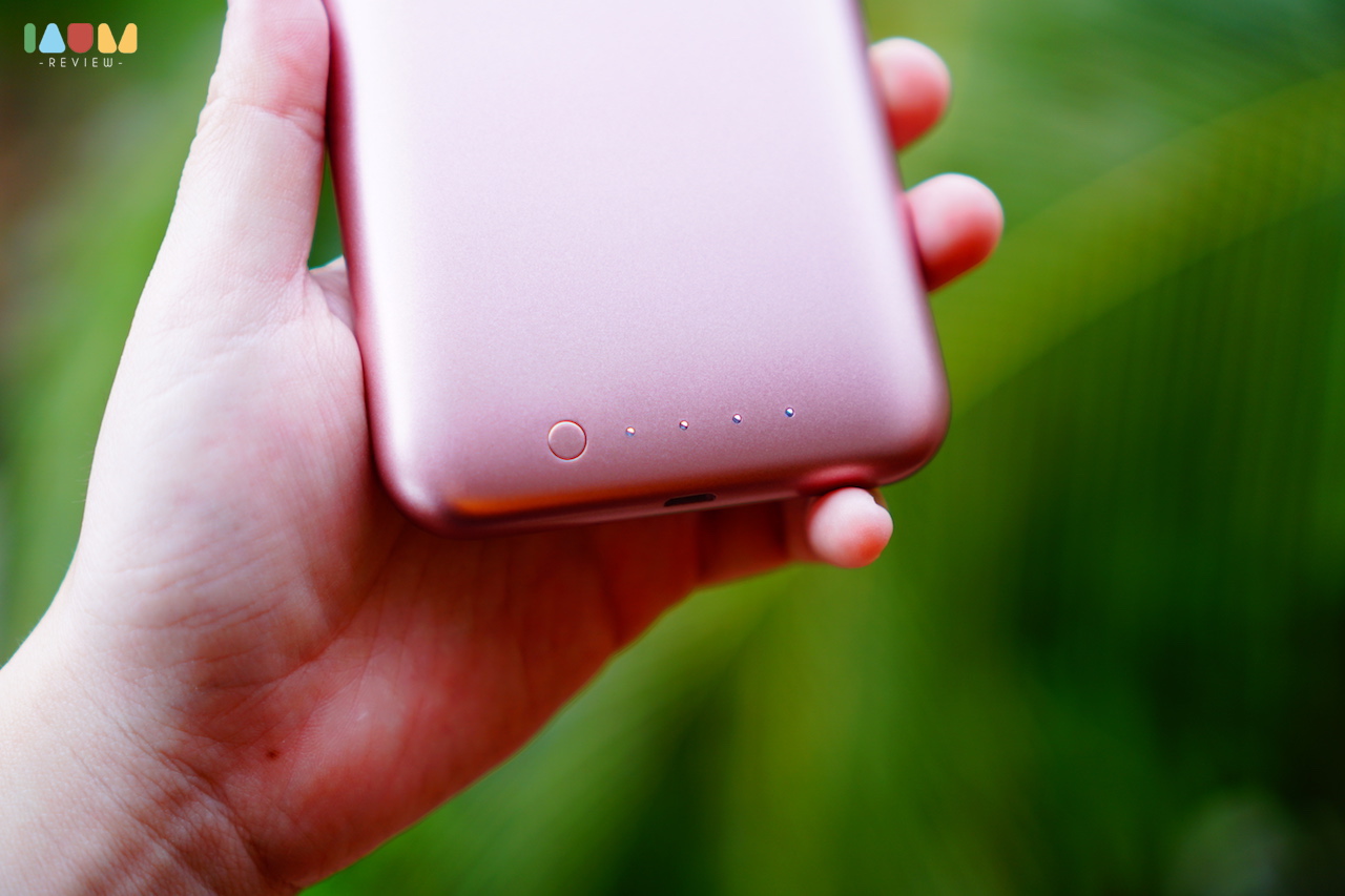 พลิกมาดูที่ด้านหลัง จะมีปุ่ม Power อยู่่ด้านล่าง ให้กดสั้นๆ 1 ครั้ง เพื่อเช็คสถานะแบตเตอรี่ที่เหลืออยู่ใน juice pack air แต่ถ้าต้องการชาร์จ ให้กดค้างเอาไว้ กระแสไฟก็จะวิ่งเข้าสู่ iPhone 7 Plus ของเรา ขอสรุปจุดเด่นของ juice pack air สำหรับอุ้มดังนี้นะคะ