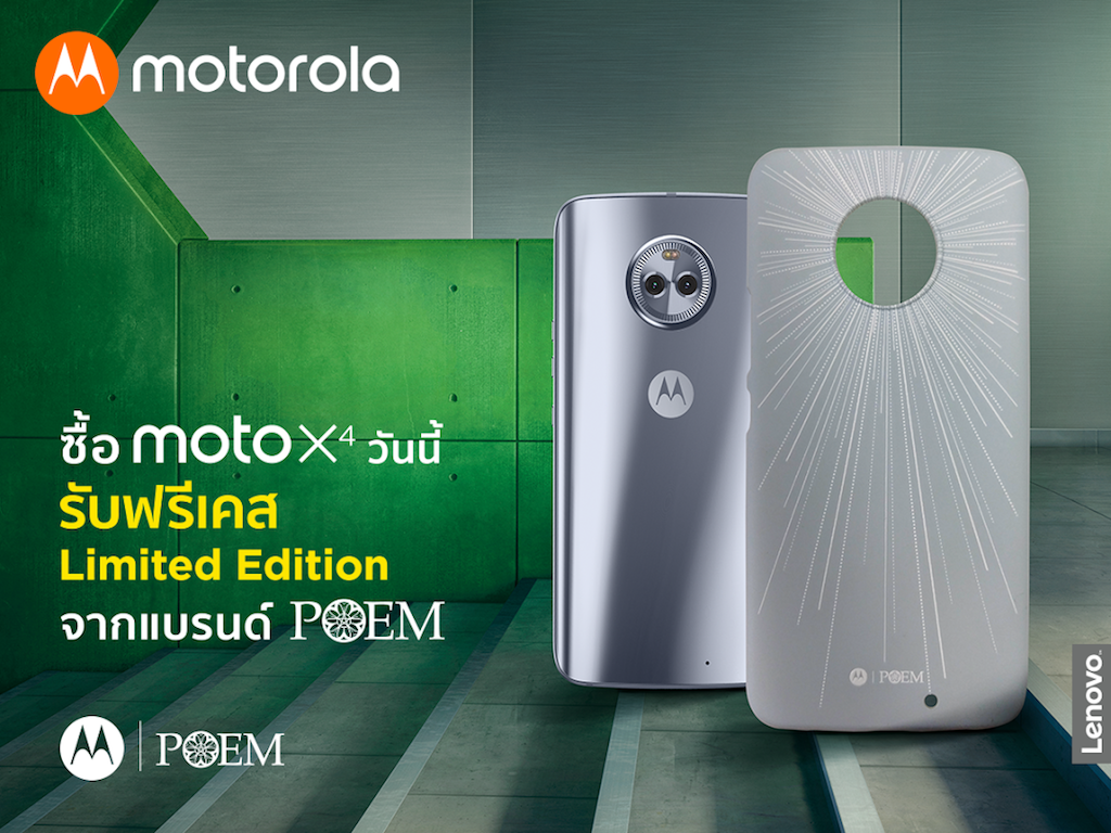 Moto X4 มากับราคา14,990 บาท แถมฟรี Exclusive case จาก POEM สามารถหาซื้อได้แล้วที่ Trueshop, Jaymart, TG Fone, Big C และ Banana IT หรืออีกช่องทาง Motorola Thailand Official Store บน Lazada >>> https://goo.gl/SsDFKF