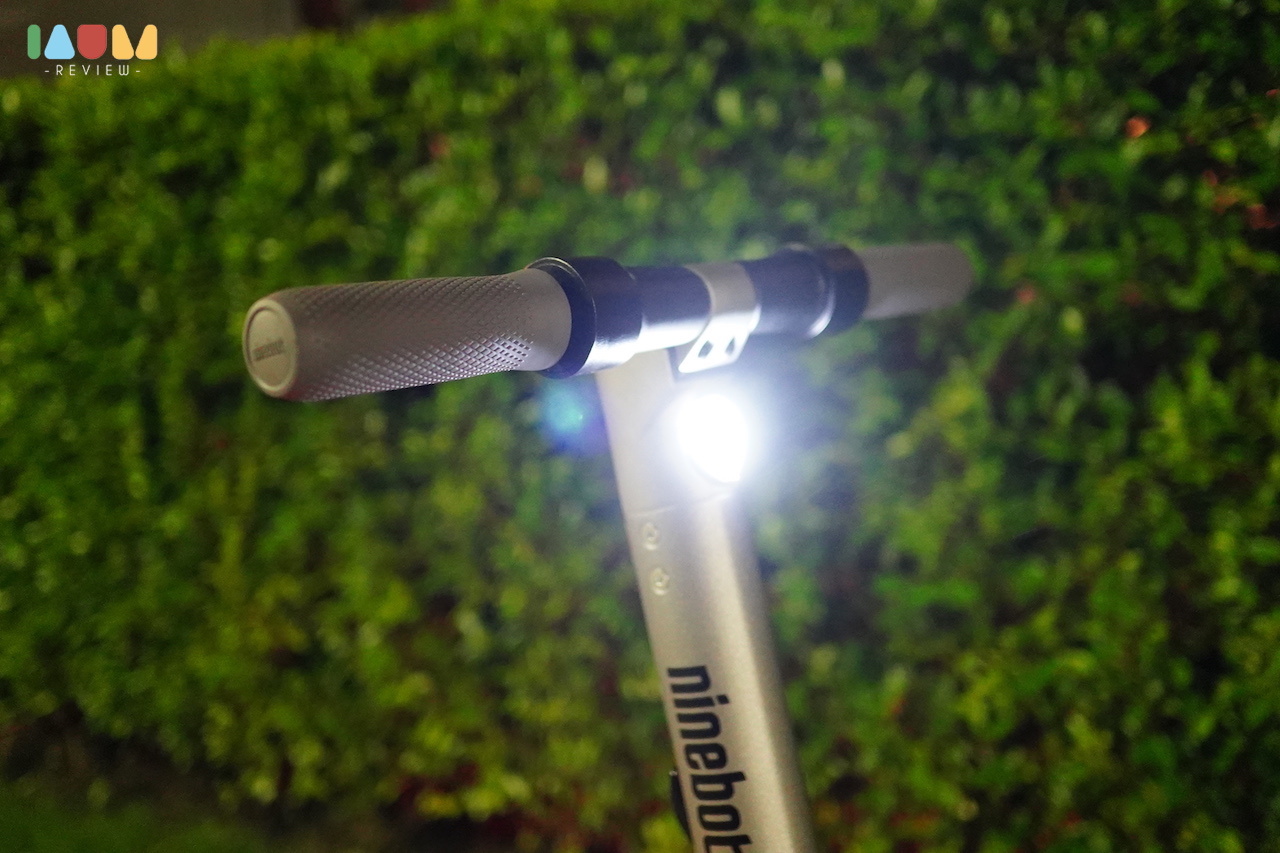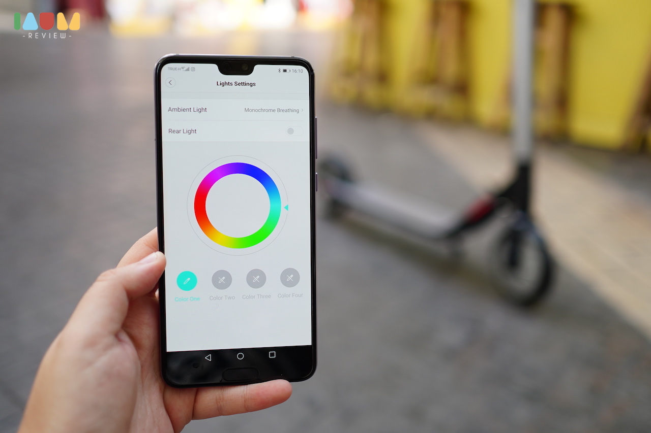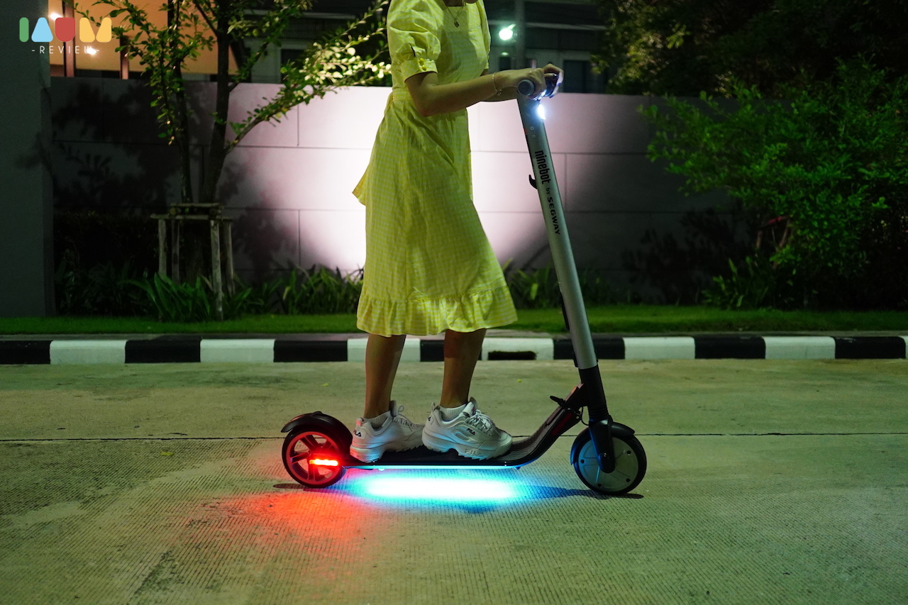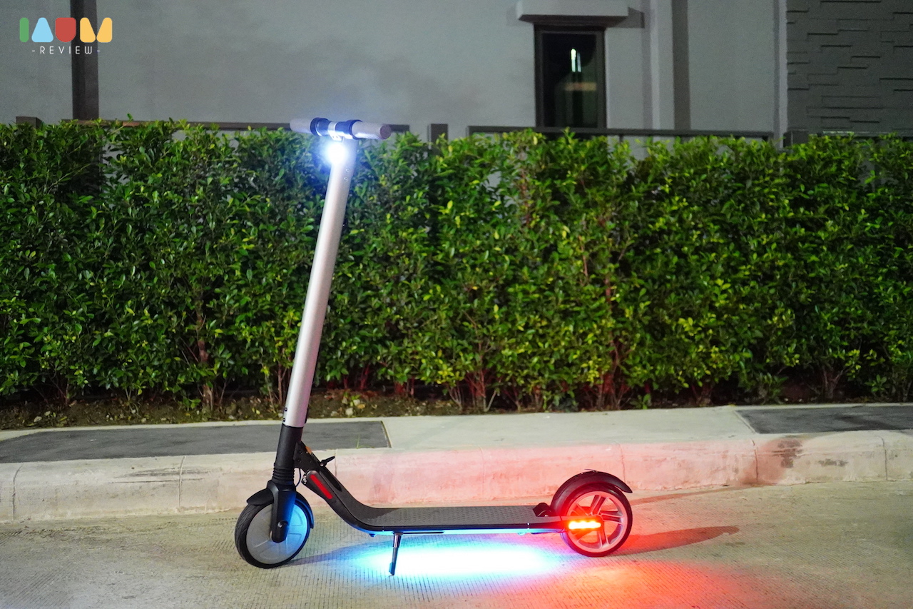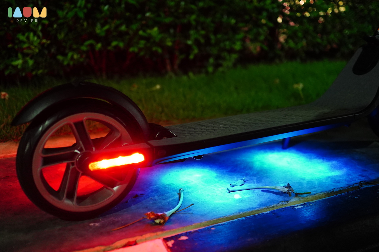 เจ้า KickScooter มีไฟรอบคันจริงๆ เริ่มตั้งแต่ไฟ LED ด้านหน้า ส่องสว่างสีขาว ทำให้สังเกตุเห็นได้ง่ายๆ ไฟ LED สีแดงด้านหลัง ที่ติดตลอดเวลา และจะกระพริบถ้าเราเบรก และเจ๋งที่สุดคือ ไฟใต้ท้องเครื่อง ที่สามารถปรับแต่งสีได้ในแอพ มีรูปแบบของไฟที่หลากหลายมากๆ เท่สุดๆ