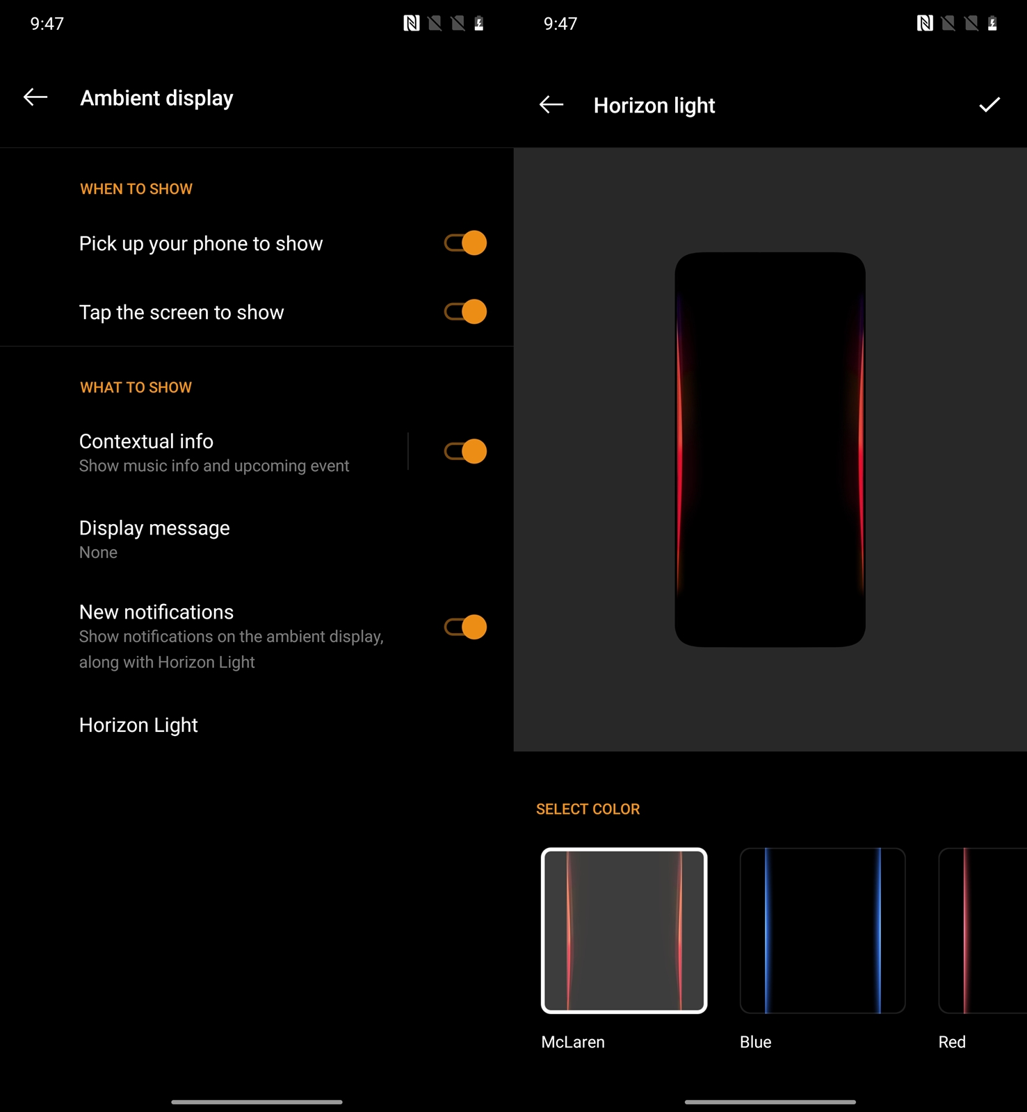 แสดงไฟแจ้งเตือน เป็นไฟด้านข้างหน้าจอ มีสีส้มธีม McLaren ให้เลือก โดยกำหนดได้ว่า หยิบมือถือขึ้นมาแล้วแสดงไฟขึ้นมา และแสดงตอนที่มีการแจ้งเตือน Notification