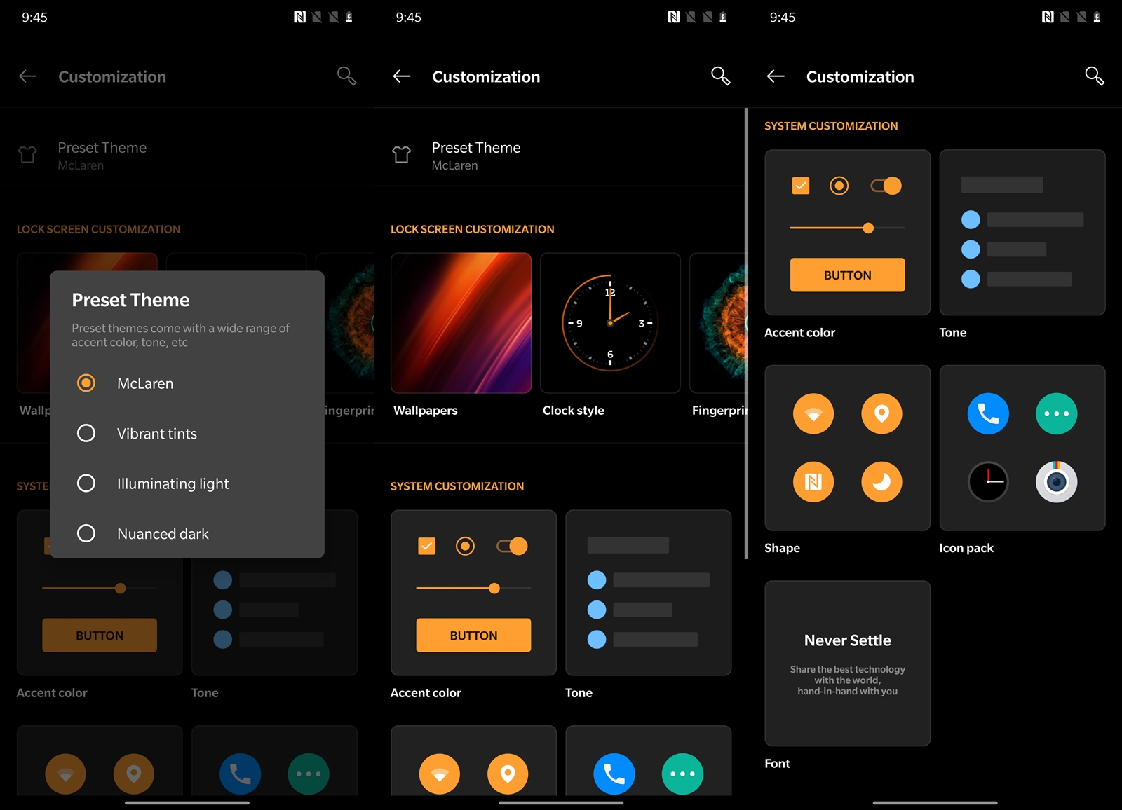 ทั้งไอคอนแอป สีตัวอักษร ตามธีม McLaren เลย ข้อดีคือ การใช้โทนสีดำ ก็เป็นโหมดที่ประหยัดพลังงานในการแสดงผลหน้าจอด้วย