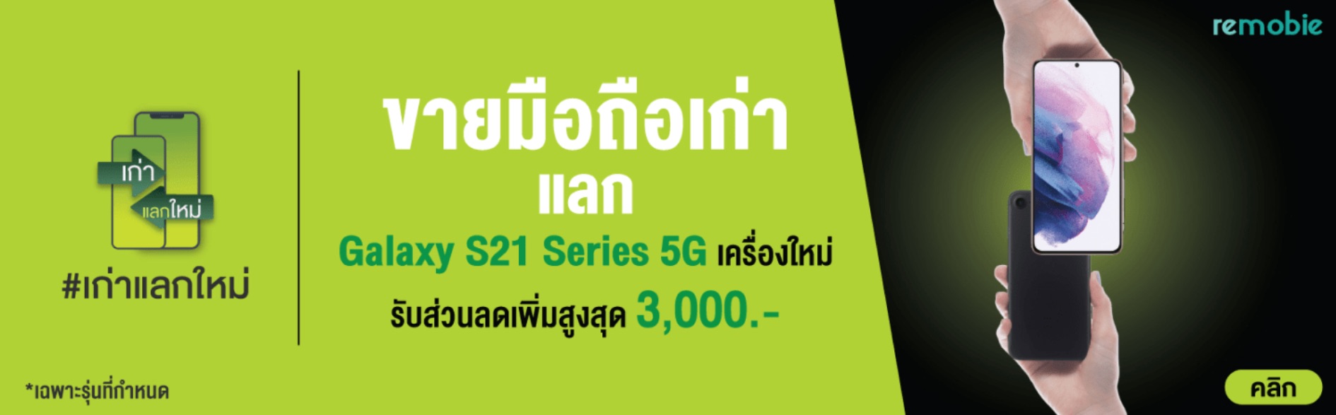 Easy Swap นำเครื่องเก่ามาแลกซื้อเครื่องใหม่กับทรู รับคูปองส่วนลดเครื่องเดิมสูงสุด 23,500 บาท พร้อมรับส่วนลดเพิ่มสูงสุด 2,000 บาท เฉพาะลูกค้าที่ซื้อ Samsung Galaxy S21 Series เท่านั้น รายละเอียดเพิ่มเติมที่ https://easyswap-true.remobie.com