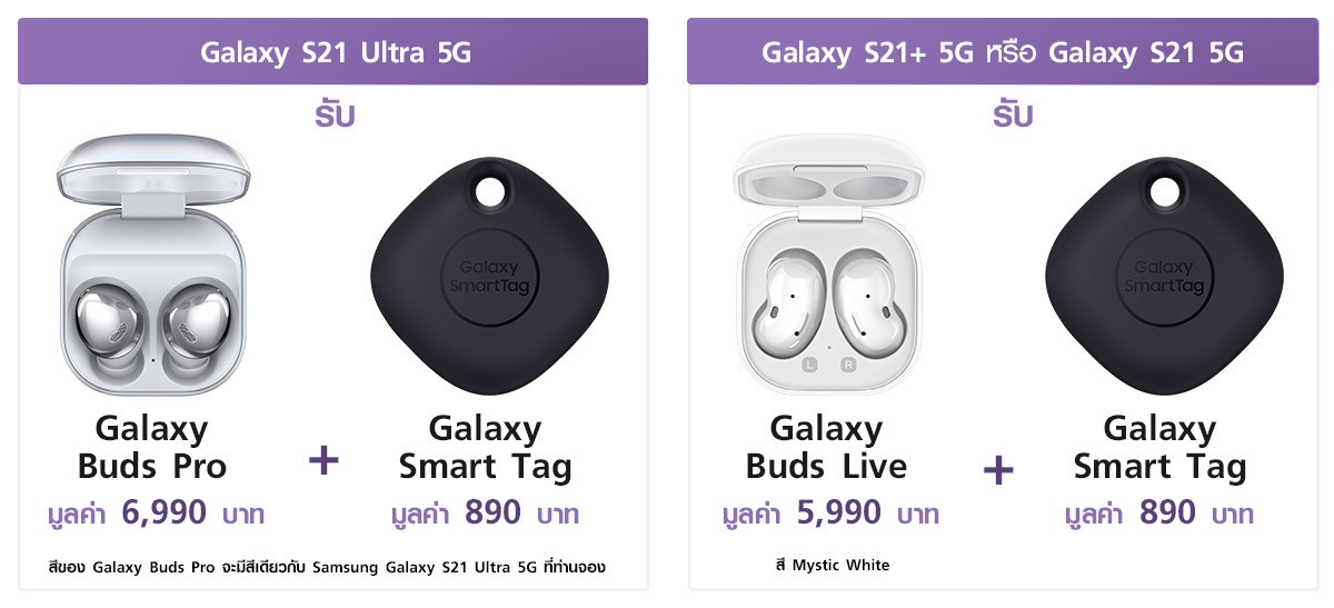 - จอง Galaxy S21 Ultra 5G รับฟรี หูฟังไร้สายรุ่นใหม่ล่าสุด Galaxy Buds Pro มูลค่า 6,990 บาทคู่กับ Galaxy SmartTag มูลค่า 890 บาท