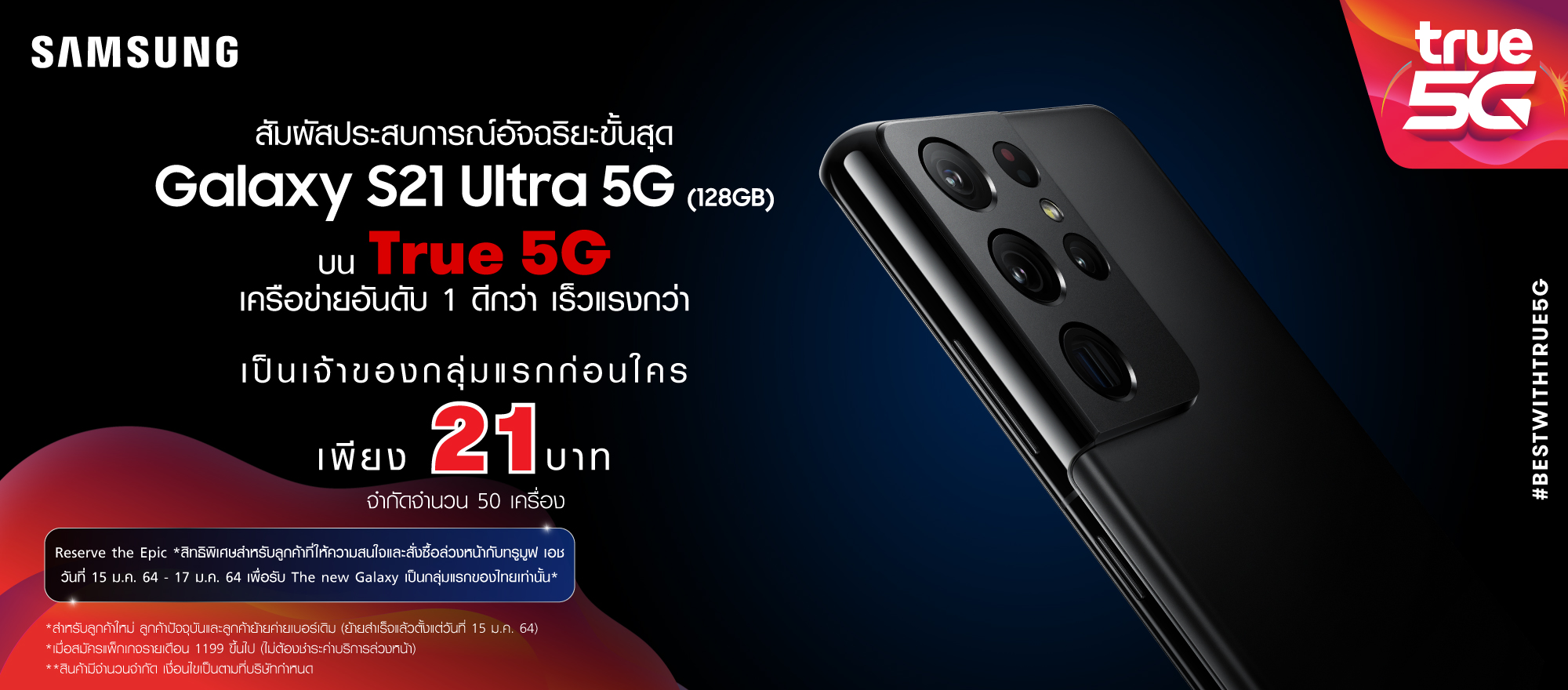 - กดจอง Samsung Galaxy S21 Ultra (128 GB) ในวันที่ 15 ม.ค. 64 – 17 ม.ค. 64 นี้ โดยเสียค่าจองตามปกติ 2,140 บาท ถ้าได้โปรจ่าย 21 บาท ทรูจะคืนเงินให้ตอนหลัง