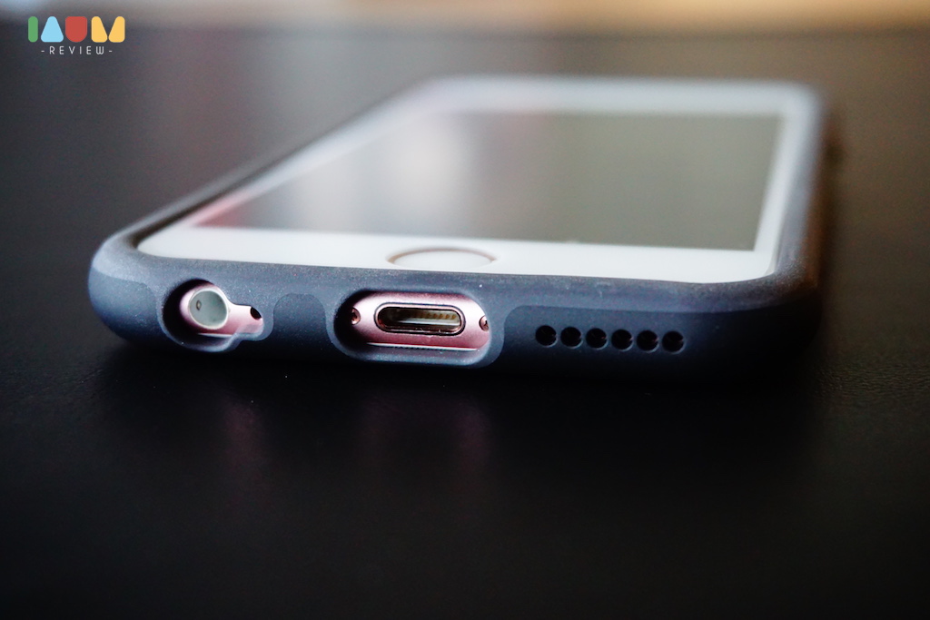 ส่วนของปุ่มต่างๆ วางออกมาได้พอดิบพอดี ลองทดสอบกดดู สามารถกดได้ง่าย และมีจุดเด่นที่ตรงรูเสียบสาย Lightening ที่เจาะมาอย่างใหญ่ เรียกว่าเสียบสายได้เกือบทุกรุ่นแน่นอนค่ะ
