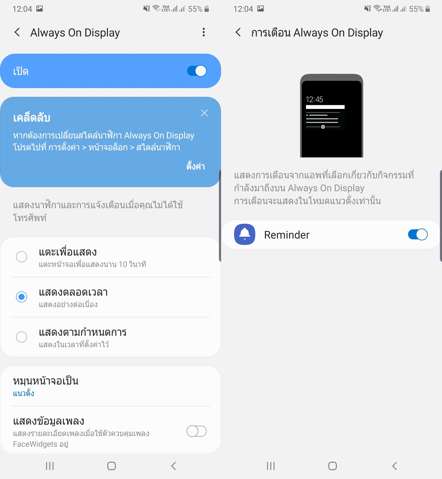 Galaxy A50s มีหน้าจอ Always On Display แสดงเวลา ระดับแบตเตอรี่ ตอนปิดจอ เหมือนรุ่นใหญ่ๆ โดยไม่ต้องกดปุ่ม Power เพื่อเปิดจอดูเวลาบ่อยๆ สะดวกดี