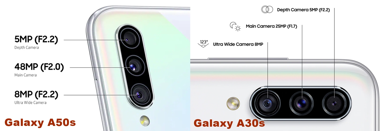ถ้าเอาเรื่องกล้อง แม้ทั้ง 2 รุ่นจะมีกล้องหลัง 3 เลนส์เหมือนกัน แต่ความละเอียดกล้องหลังต่างกัน Galaxy A50s ความละเอียดสูงสุด 48MP f2.0 ส่วน Galaxy A30s ความละเอียดสูงสุด 25MP f1.7 ถ่ายภาพในที่แสงน้อยได้คมชัด