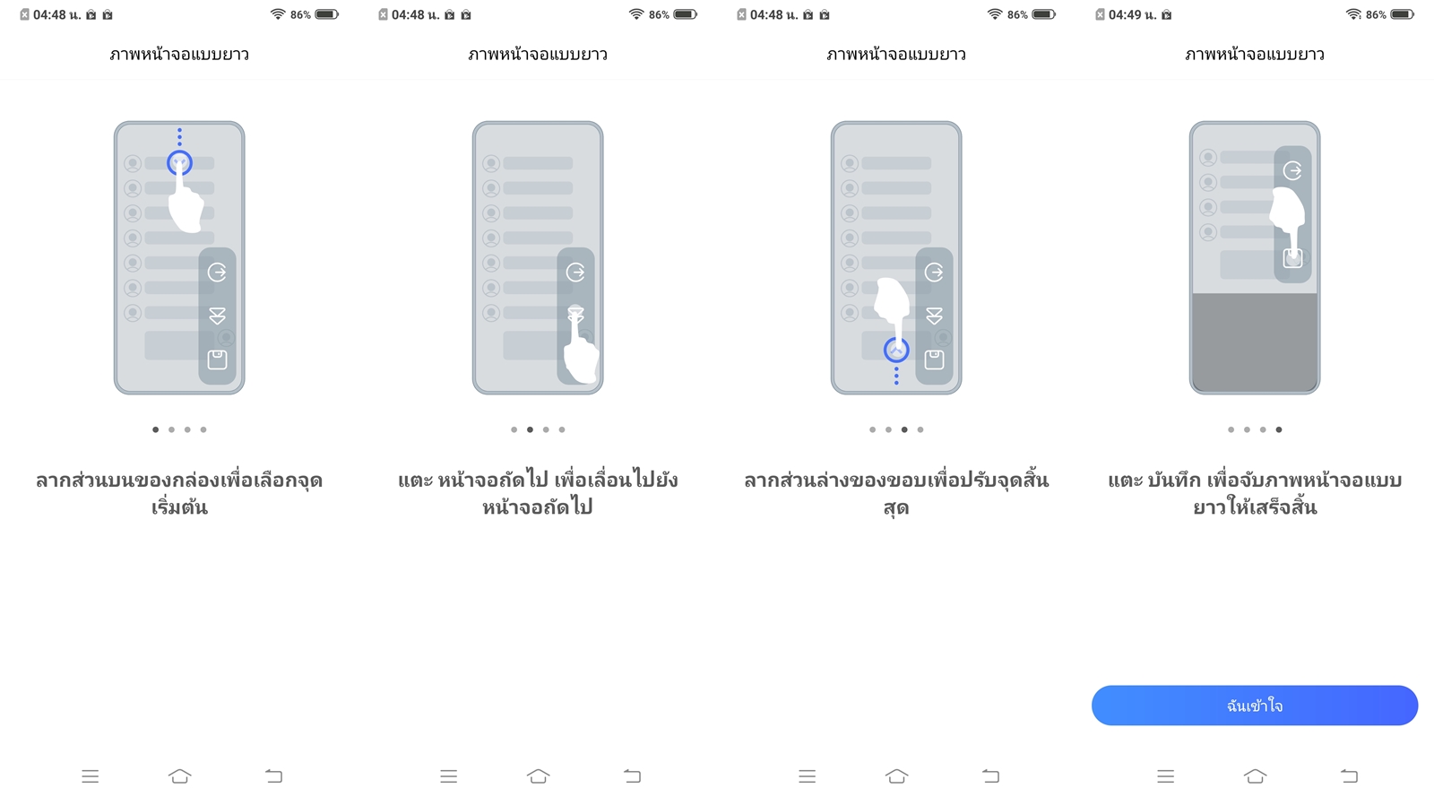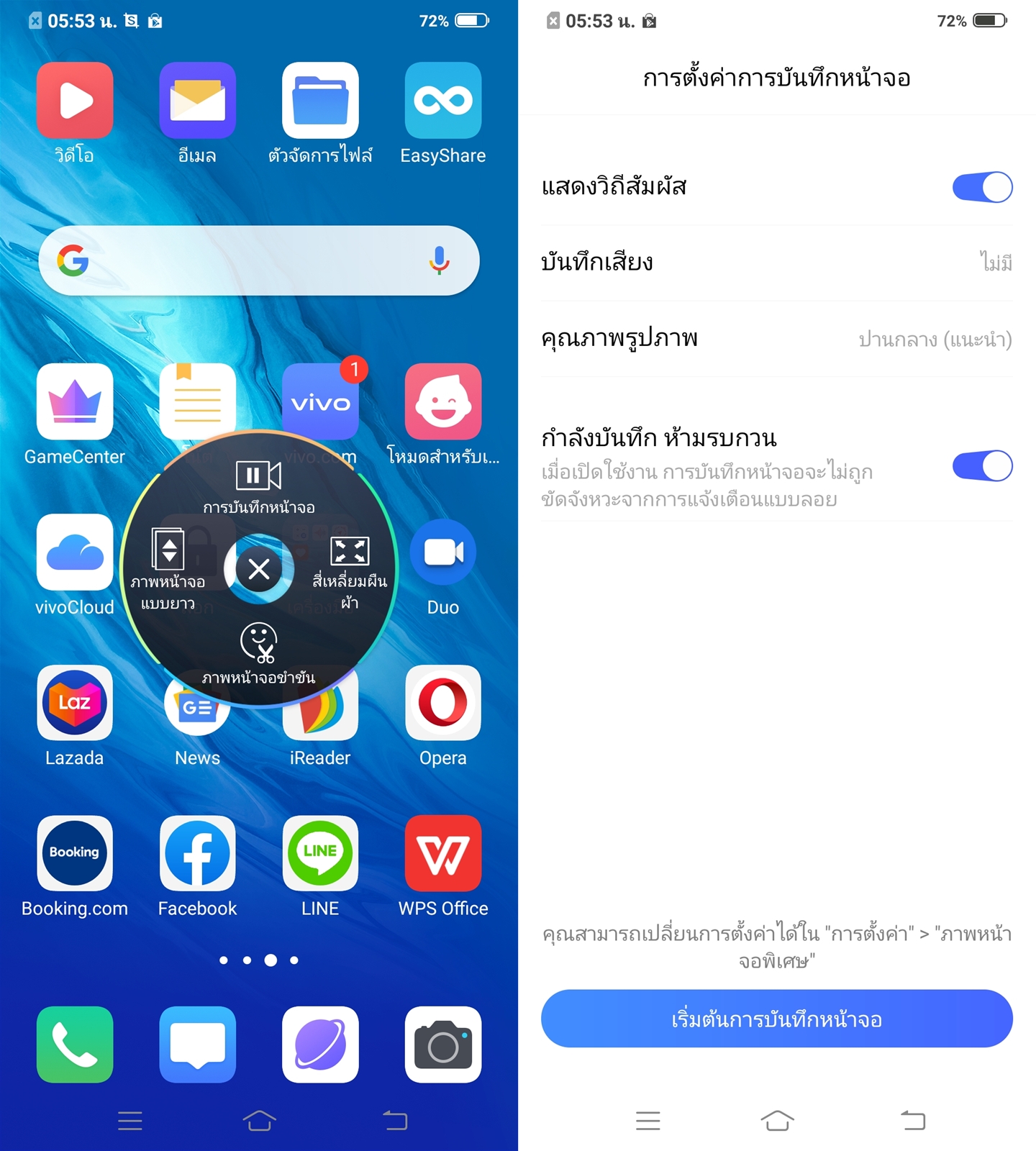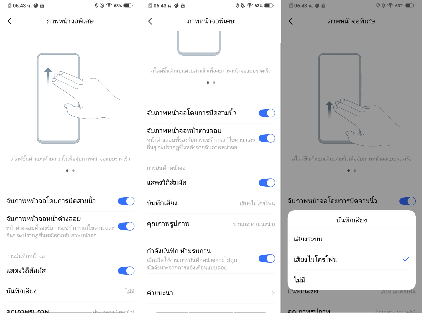Gesture ง่ายๆ คือใช้ 3 นิ้วปัดขึ้นในแนวล่างขึ้นบนตามภาพ และบันทึกวีดีโอหน้าจอ พร้อมเสียงในแอป หรือใช้ไมโครโฟน และปิดการแจ้งเตือนขณะที่บันทึกวีดีโอหน้าจอได้ด้วย