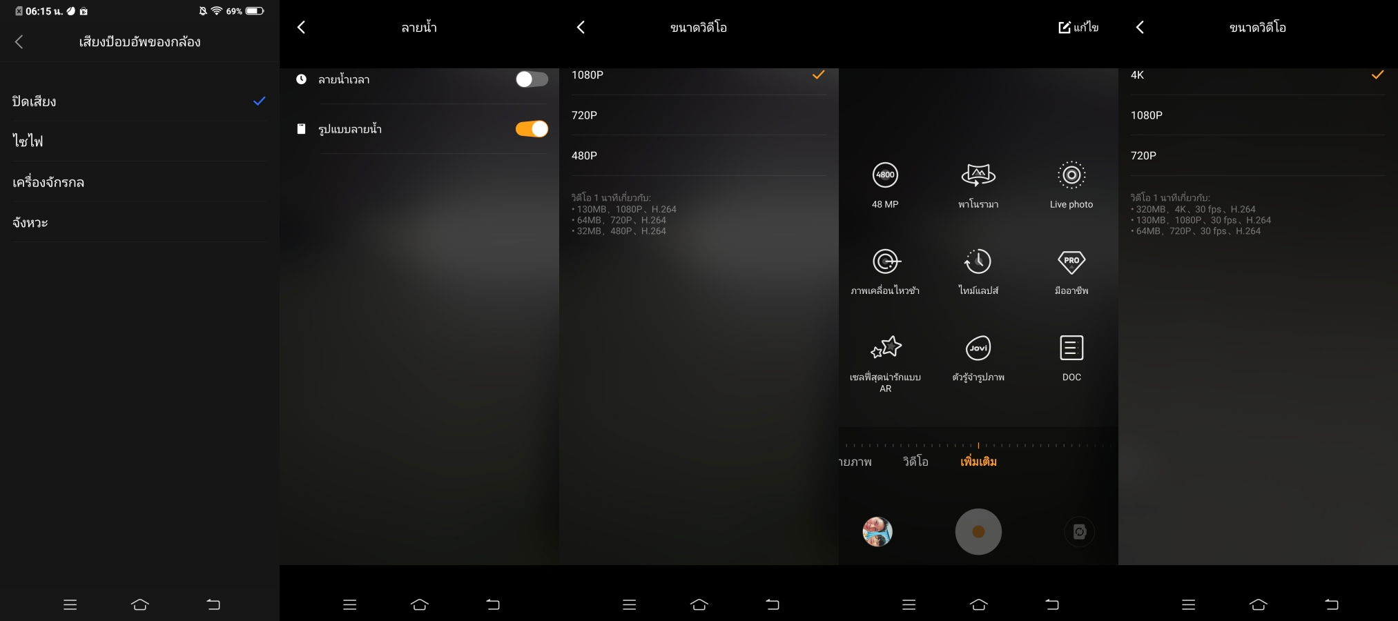 สามารถปิด – เลือกเสียงเลื่อนกล้องหน้าป๊อบอัพได้ ใส่ลายน้ำ และเวลาในภาพได้ เลือกความละเอียดในการถ่ายวีดีโอ กล้องหน้าสูงสุด Full HD และกล้องหลังสูงสุด 4K และเลือกโหมดถ่ายภาพ เช่น 48MP โหมด Pro