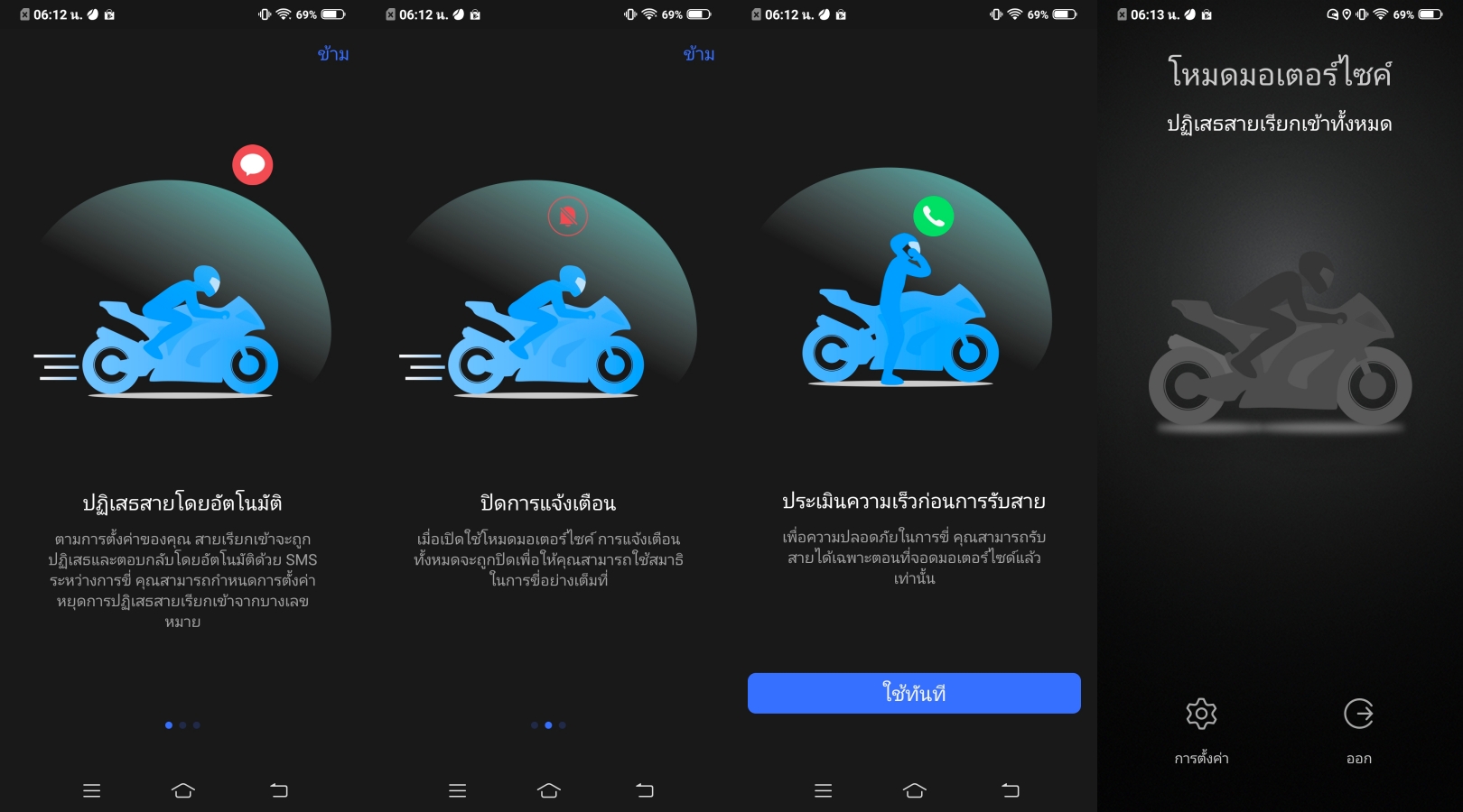 โหมดใช้งานขณะขี่มอเตอร์ไซค์ ถ้าเปิดโหมดนี้ จะทำให้ปฏิเสธการรับสายอัตโนมัติ ปิดการแจ้งเตือนที่รบกวนสมาธิการขับรถ หรือถ้าจะรับสายก็จะประเมินความเร็วรถว่าเหมาะจะรับสายหรือไม่ เพื่อความปลอดภัยในการขับรถ