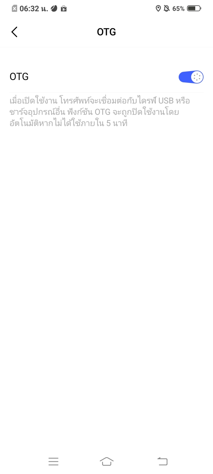 ถึงแม้ว่ารุ่นนี้จะเพิ่ม MicroSD ไม่ได้ แต่ก็รองรับ USB OTG หมายถึงเสียบ USB Flash Drive หรือ Thumb Drive ได้ โดยจะต้องมาเปิดฟังก์ชั่นตรงนี้ก่อน แล้วเสียบแฟลชไดร์ว ถ้าไม่มีการใช้งาน 5 นาทีก็จะปิดอัตโนมัติ